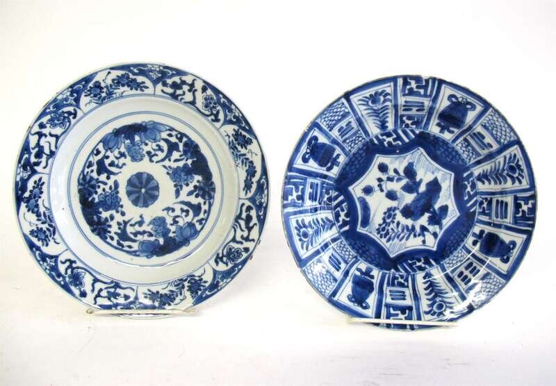 Comprising a kraak-designed shallow dish with a Kangxi lozenge mark and an unmarked floral plate with central pinwheel.