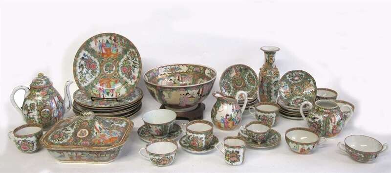 Including a lidded tureen, punch bowl, two teapots, two sugar bowls, creamer, twenty-four cups and saucers, and a scalloped-edge serving dish. (32).