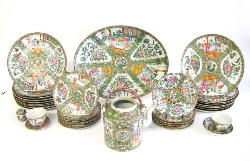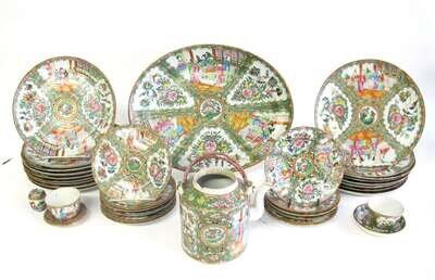 Including a large oval platter, seventeen dinner plates, twelve saucers, teapot, two teabowls, small dish, and mini lidded canister with underplate, all enamel and gilt decorated in the rose medallion palette. (36).
