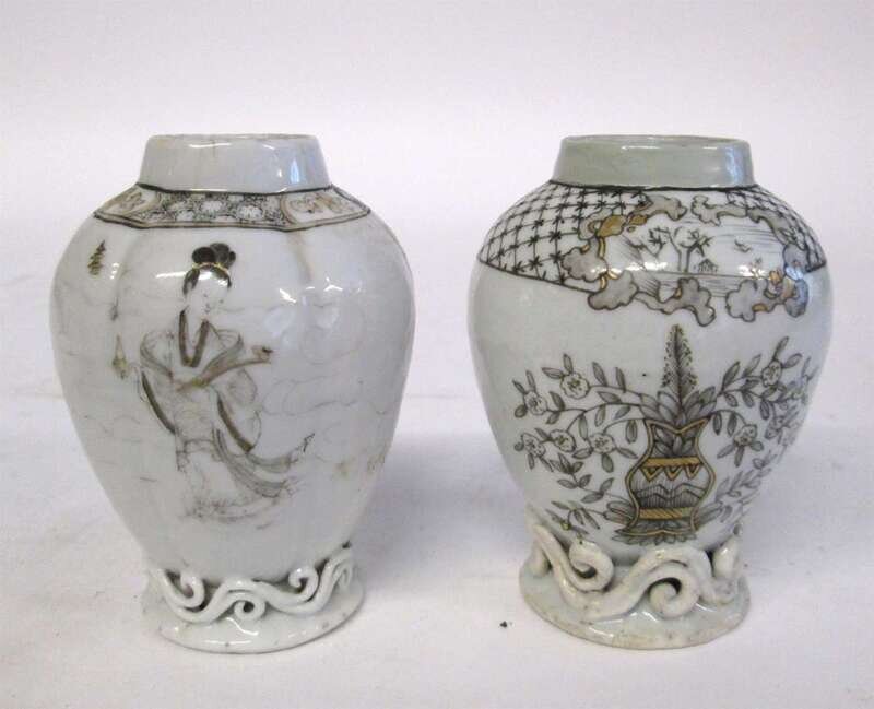 Both of ovoid form with raised scroll detail to base, one with lobed body and decoration of Chinese figures and deer, the other with with urn and floral bouquet.