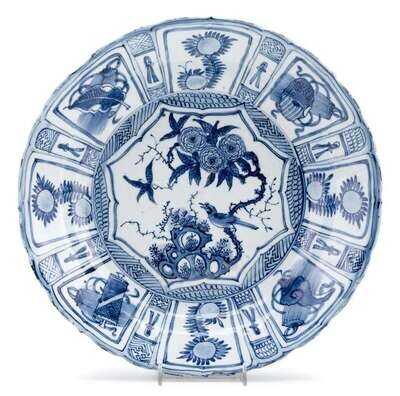 Circular with barbed rim, the walls with rectangular panels in blue and white underglaze decoration of flowers and Buddhist motifs, the central reserve painted with a bird perched amongst a flowering branch, the underside with repeating circular motif.