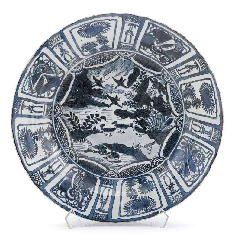 Circular-form, the center showing ducks both in flight and standing on the river bank, the border painted with an alternating design of floral blossoms.