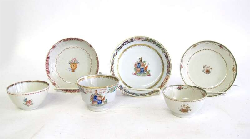 Comprising armorial cup and saucer with Hay family crest and motto "Spare Nought" and polychrome border of dragons; together with two teabowls and saucers decorated with floral sprigs in rose and green palettes.