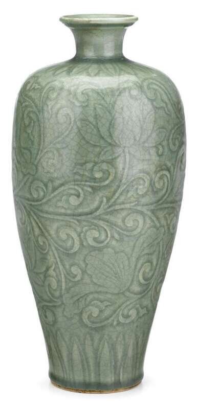 Of slender baluster form, carved with a lotus pattern to body between foliate bands at base and shoulder.