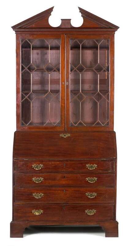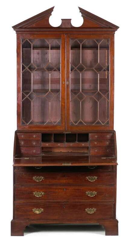 In two sections: the upper case with dentil molded broken arch pediments above twin astragal glazed cupboard doors that open to three shelves above four small drawers, the lower case with slant-front writing surface that opens to the usual arrangements of drawers and pigeonholes, above four bead-molded graduated long drawers, supported on bracket feet.
