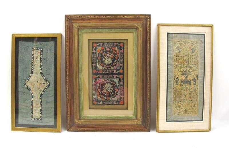 The framed textiles finely embroidered to depict figures or animals in landscapes, one with a carved jade cartouche.
