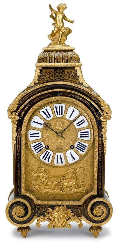 The pieced circular dial with blue Roman numerals painted on white enamel, set into a backplate depicting a celestial figure on horse-drawn chariot, the premiere partie marquetry case surmounted by a strident putti on a cavetto molded plinth, raised on toupie feet, the brass movement engraved "P Le Roy Paris".