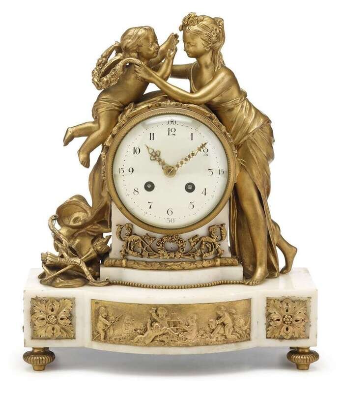 Louis XV style figural gilt bronze and white marble mantle clock 'Venus and Cupid' 19th century, marked pre leurtier paris