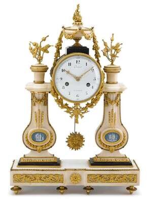 Louis XVI white marble, gilt bronze, and jasperware mounted mantle clock circa 1790, the dial signed for drouot and coteau