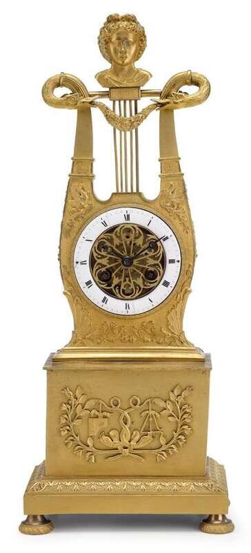 French gilt bronze lyre-form mantle clock circa 1815