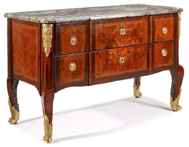Louis XV/XVI transitional marquetry inlaid, marble and gilt-bronze mounted commode 18th century and later