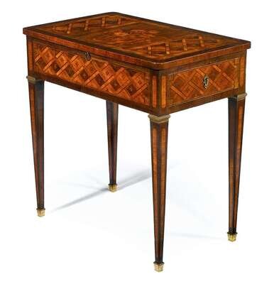 The rectangular top with floral marquetry center framed by trellis parquetry panels, over parquetry inlaid frieze, concealing a slide faced with a tooled and gilt leather writing surface, supported on square tapering legs terminating in gilt-bronze sabots.