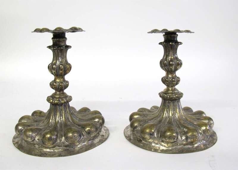 Baluster-form with scalloped bobeches, above reeded standard and wide, lobed base.