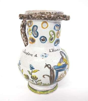 The body polychrome painted with an allegory of winter within a landscape, titled "L'Hiver" and inscribed "Jules Dardon a Pierre Veron" to body, the neck pierced with circular and kidney-shaped cut-outs, the handle and rim sponge-decorated.