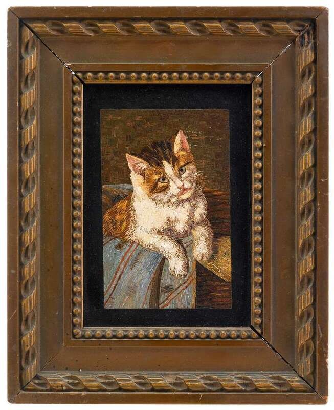 The finely-worked rectangular panel of multi-colored tesserae depicting a calico cat, inset to a black background, bearing partial Vatican Workshop paper label.