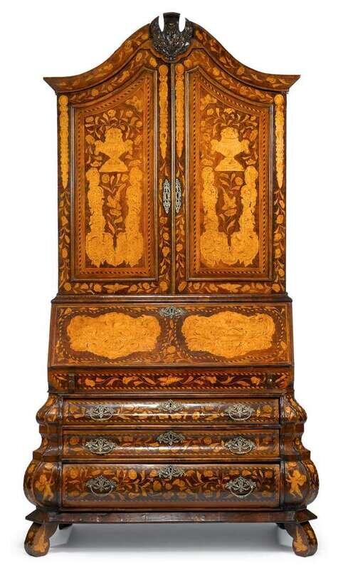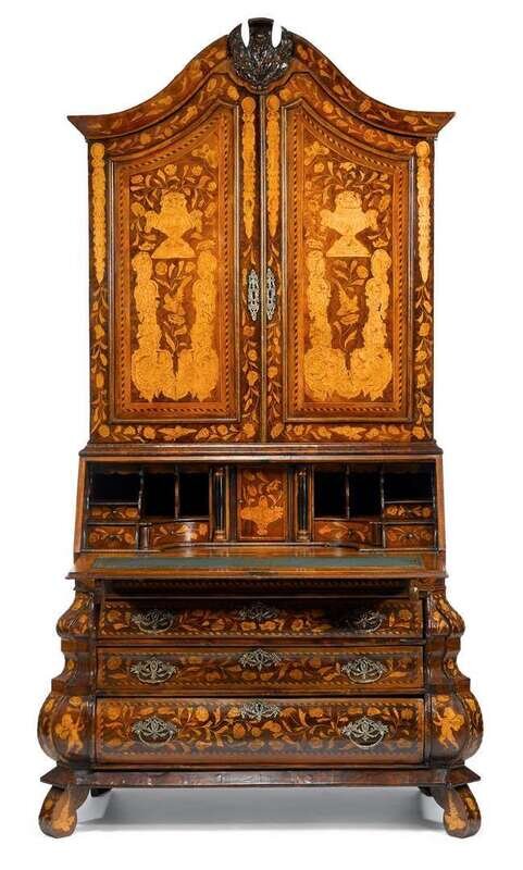 In two parts: the upper section with swan-neck pediment centered by thistle-carved cartouche, over twin bird and foliate marquetry-inlaid cupboard doors, opening to two shelves, the lower section with slant-front lid opening to reveal a tooled and gilt leather writing surface and an assortment of marquetry inlaid drawers and pigeonholes, above floral marquetry inlaid bombé case with three drawers, raised on scroll feet.