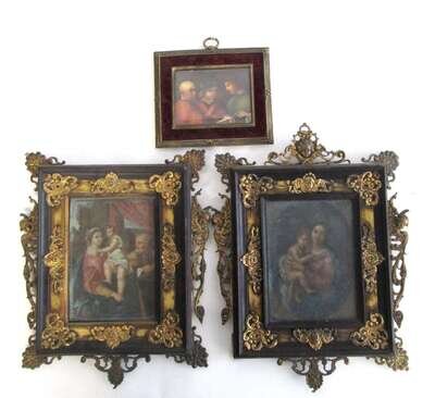 Including painting of three gentleman within a velvet and gilt metal frame, and pair of religious scenes within gilt metal and molded wood frames.