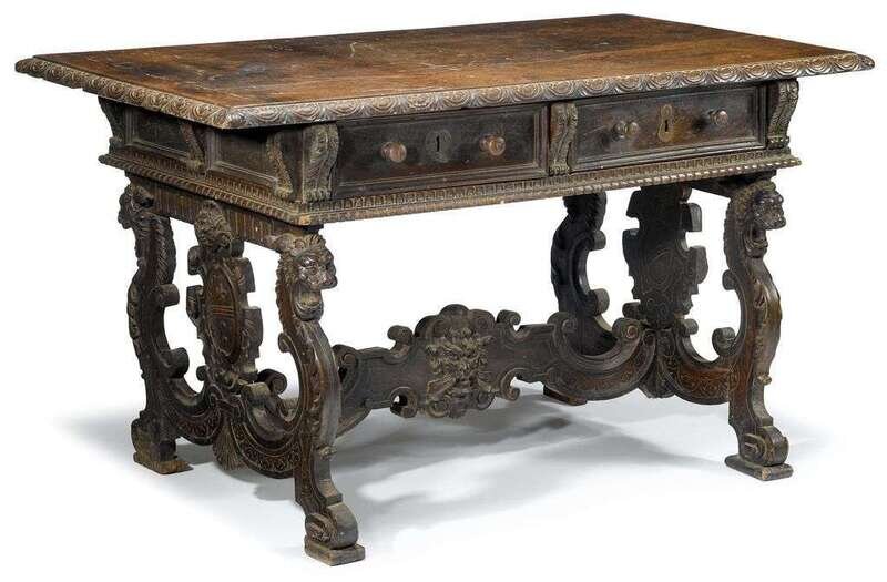 The rectangular top with foliate-molded edge, above carved frieze with two drawers on one long side and two dummy drawers on the other, supported on shield and lion's head carved tressle supports, joined by C-scroll and lion's mask carved stretcher, terminating in scroll feet.