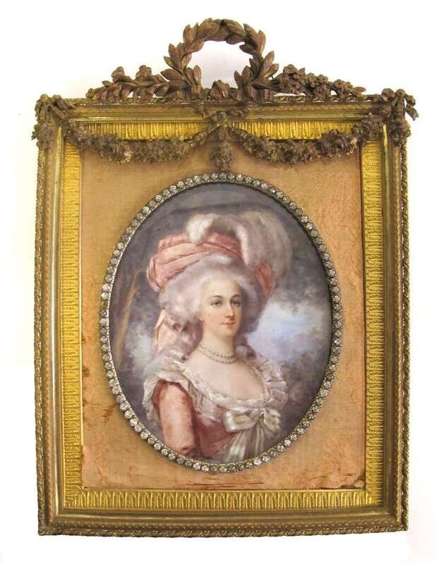 Oval, depicting Marie Antoinette in pink and white dress, signed "Regnol" lower right, the gilt bronze frame with oval paste-set border and crest of laurel wreath and floral swags.