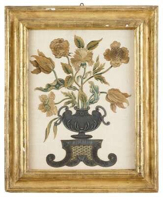 Stitched and crewel-worked in polychrome silk to show a flower-filled vase, in gilt gessoed wood frame.