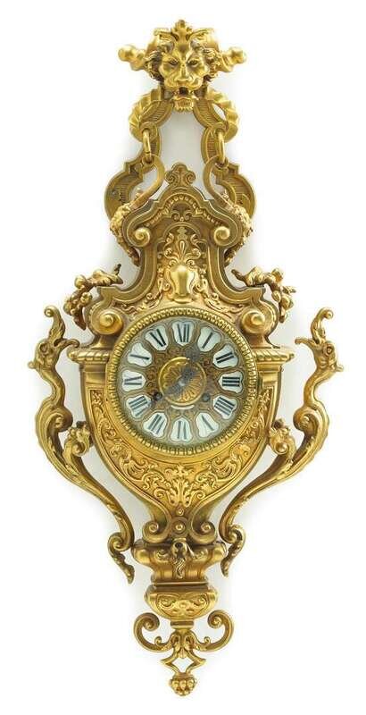 The circular dial with Roman numeral painted porcelain hours and engraved steel hands, within an elaborate rococo style case toped by a lion and knocker above shaped body cast with masks, fruit clusters, and twin dragon handles, the brass movement stamped for Tiffany & Compe New York and circular maker's mark EDM.