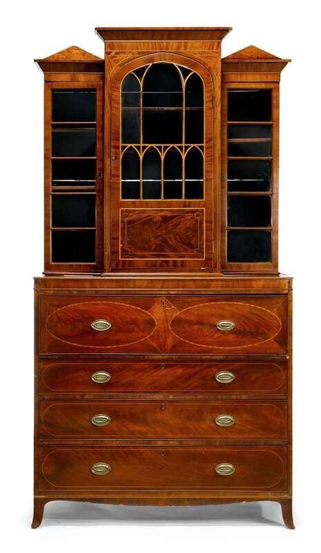 In two parts: the stepped cornice over breakfront cabinet of three glazed cupboard doors, the central astragal glazed door opening to three fixed shelves, the flanking rectangular doors opening to two adjustable shelves; the lower section with secretaire drawer faced with twin oval inlays, opening to an arrangement of pigeon holes and drawers, above three graduated line-inlaid and cockbeaded long drawers, raised on shaped bracket feet.