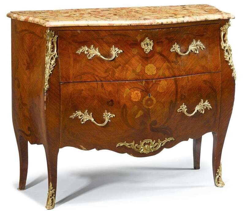 Louis XV style marquetry inlaid gilt bronze mounted marble top kingwood commode early 20th century