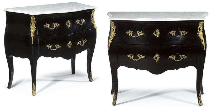 Pair of Louis XV style gilt bronze mounted marble top ebonized bombé commodes 20th century