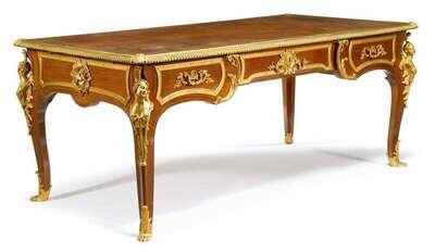 The rectangular top with gilt-bronze mounted edge and inset with tooled and gilt brown leather writing surface, over three drawers and three dummy drawers, the sides mounted with masks, and concealing a sliding leather writing surface, over caryatid mounted cabriole legs, terminating in foliate and paw-cast sabots, interior drawer bearing brass plaque "Rinck à Paris", the underside branded M. RINCK.
