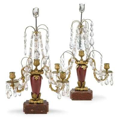 Pair of Swedish glazed ceramic, marble, and gilt bronze mounted girandoles 19th century