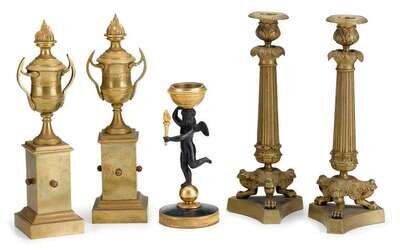 Including pair of urn-form candlesticks with an interchangeable flame and candlecup finial, supported on plinth base; a pair of napoleonic style candlesticks with a tapering reeded support issuing an acanthus-leaf cast candlecup, supported on three paw feet and tripartite base; and a single putti-cast candlestick holding a torch, supported on ball and circular base.