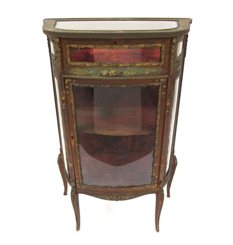 Demilune profile with lip-top beleveld glass lid painted with floral sprigs against gilt backgrond, above two-shelf interior, raised on cabriole legs.