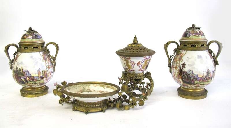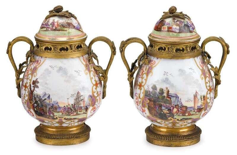 The urns surmounted by domed lids with leaf sprig finial over C-scroll pierced collar, the baluster body flanked by twin vine and leaf cast handles, the body and cover painted with scenes of ships and merchants, on circular reeded feet ring; together with perfumirere, underglaze blue crossed sword marks, gilt painted number 74.