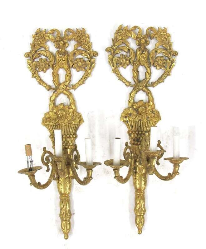 The cornucopia and basket cast backplate issuing three scroll-form candlearms.