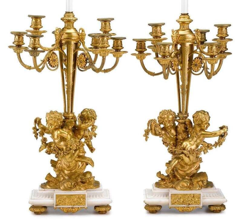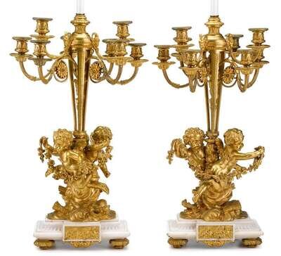 Each modeled with twin putti in flight holding a floral garland issuing nine candlearms terminating in leaf-cast nozzles, raised on stepped marble plinth, on toupie feet. Fitted and wired for electricity.