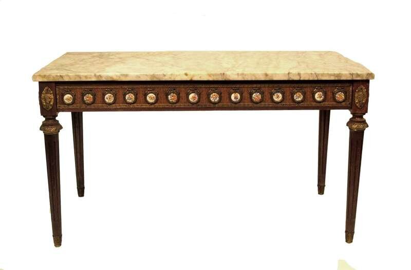 The rectangular white marble top over frieze mounted with floral painted circular porcelain plaques mounted in wreath-cast frames, supported on fluted round tapering legs terminating in foliate-cast sabots.