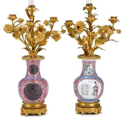 Pair of gilt bronze mounted Chinese export famille rose porcelain table lamps early 20th century