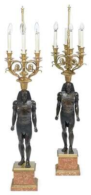 Mid-brown patina, the standing pharaoh standards supporting six scroll and foliate-cast candlearms, supported on brass and gilt bronze mounted rouge marble plinth.