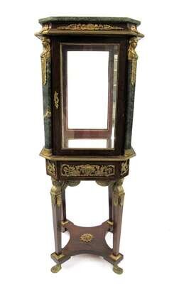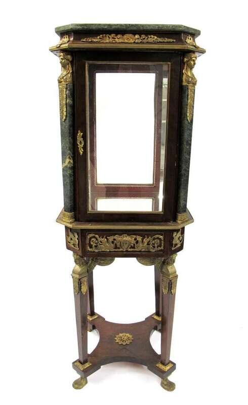 The square green marble and cavetto molded top with trophy mounts, above conforming glazed case, the corners mounted with female bust above marble columns, the single door opens to mirrored interior, above trophy-mounted frieze supported on square tapering legs caped by winged female busts, the legs joined by a conforming undertier and terminating in paw feet.