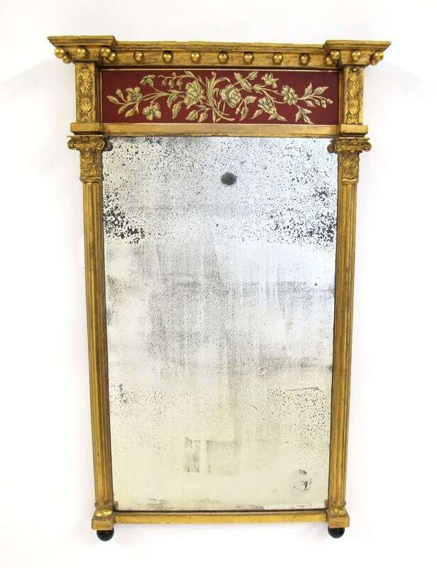 The cornice of reverse breakfront outline with ball drops avoe a rectangular eglomise panel with floral sprays against a red ground, over rectangular mirror plate flanked by twin corinthian columns.