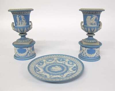 Of campana form with egg-and-dart rim and classical scenes to the body, raised on square plinth and circular base draped with garland held aloft by ram's heads; together with a dish of similar design, the central roundel displaying Nike driving a chariot, each impressed "Wedgwood' to underside. (3).