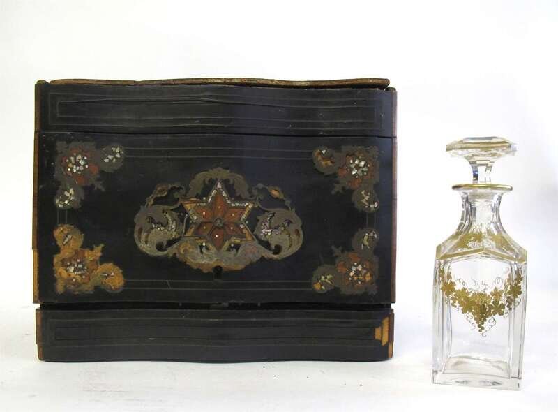 The serpentine shaped box of ebonized wood with marquetry inlay of brass, mahogany, and abalone in the shape of stars and foliate scrolls, the case opens to a gilt brass fitted interior complete with four decanters and sixteen cordials, all gilt painted with grapes and vines.