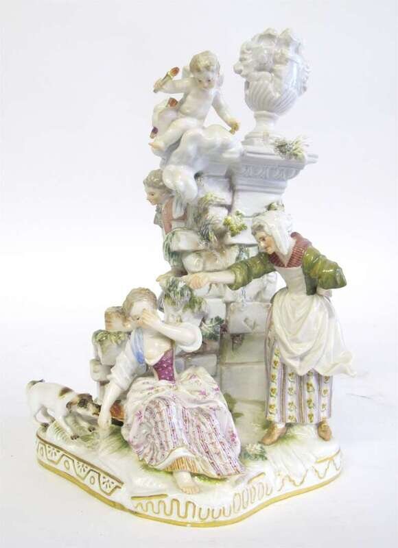 Depicting a courtship abruptly interrupted, as a mother scolds her weeping, partially undressed daughter, Cupid sits atop the wall which conceals her gentleman caller, and a small dogs pulls on his hat, underside with underglaze blue crossed swords mark, incised C17, impressed 111.