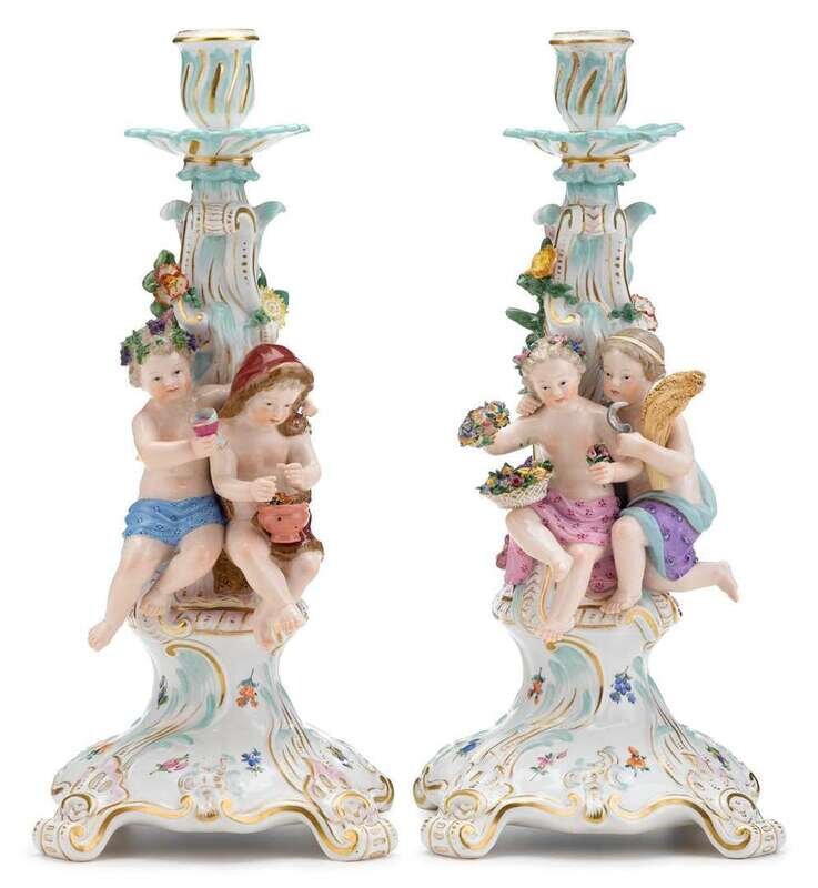 Pair of Meissen porcelain polychrome painted figural candlesticks late 19th/early 20th century