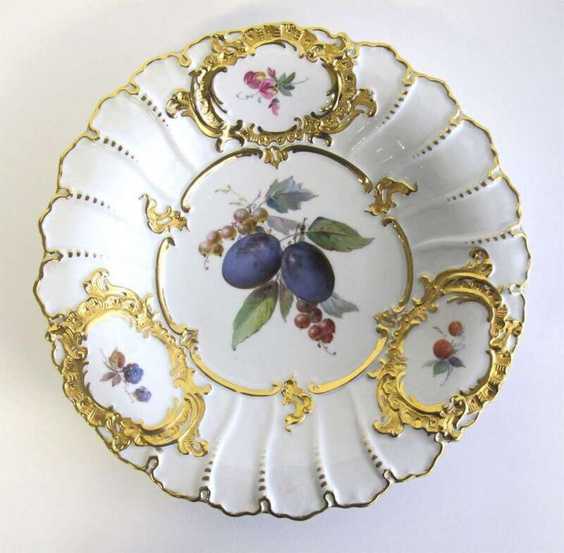 Circular, with raised and feathered edge and three vignettes of fruit clusters framed by gilt rocaille cartouche, the shallow reserve painted with plums and berries, underglaze blue crossed swords mark, impressed 152, 62.