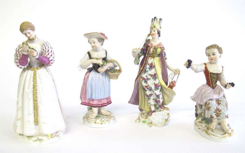 Each polychrome and gilt painted, two depicting courtly figures in fine dress, a peasant girl with basket of flowers, and a girl with berries, each marked to underside with underglaze blue crossed swords mark and impressed/incised model numbers.