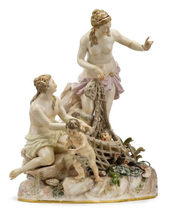 Modeled to show two partially nude nymphs and a putto hauling a net containing fish and tritons, raised on a naturalistic rocky base. Underglaze blue crossed swords mark, incised mark C35, impressed number 105 and iron red mark 18 to underside.