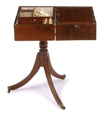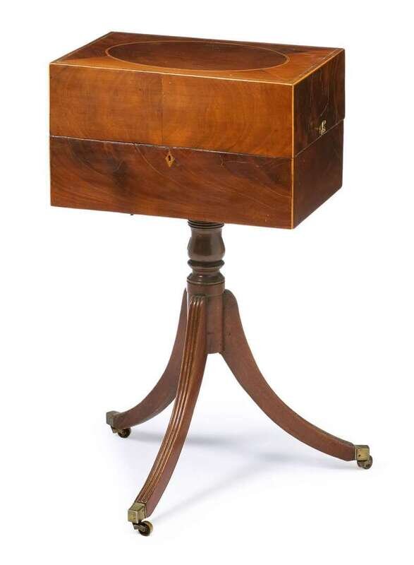 The rectangular top with oval inlay, opening to papered compartments and trays with several ivory sewing impliments, supported on turned baluster support and three downswept reeded legs with brass caps and casters.