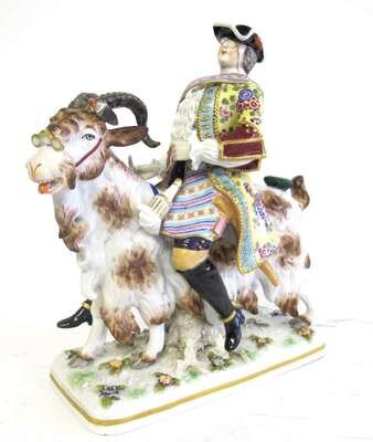Modeled as a tailor elaborately polychrome and gilt decorated with the tools of his trade, ridding atop a goat on rectangular base, underglaze blue orb and crown mark to underside.