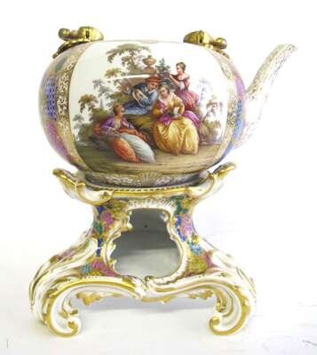 The bulbous kettle painted with vignettes of lovers and musicians in a romantic landscape, the reticulated kettle stand modeled on three acanthus-form feet, tea kettle marked with underglaze blue AR mark, the stand with underglaze blue D under crown mark.